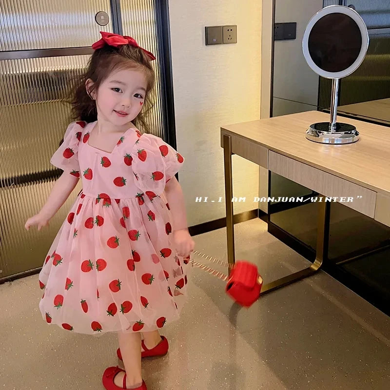 Summer Floral Girls Dresses Strawberry Short Sleeved Children's Clothing O-Neck Party Princess Dresses Vestidos kids clothes
